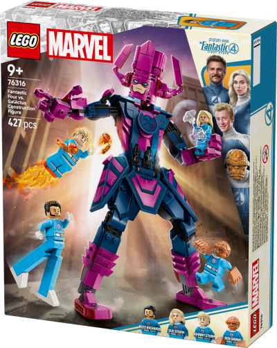 Fanúšikovia filmu Fantastická štvorka: Prvé kroky od štúdia Marvel si zinscenujú akčné momenty z filmu so stavebnicou LEGO® | Marvel (76316) Fantastická štvorka vs. zostaviteľná figúrka Galactuse, vôbec prvou stavebnicou LEGO s Fantastickou štvorkou! Táto hravá stavebnica LEGO | Marvel poslúži ako pôsobivý darček pre chlapcov a dievčatá od 9 rokov, ktorí milujú superhrdinské dobrodružstvá. Táto stavebnica LEGO | Marvel Fantastická štvorka obsahuje 4 minifigúrky: Súčasťou je Mr. Fantastic s výsuvnými nohami, Human Torch s 2 ručnými blastermi, dielikmi v podobe plameňov pripevnených k nohám a priehľadnou podperou, ktorá mu umožňuje „lietať“, Invisible Woman s 2 silovými štítmi a Thing s veľkými a mocnými rukami. Plne pohyblivá figúrka ikonického filmového zloducha Galactusa meria cez 28 cm na výšku. Táto pohyblivá figúrka naštartuje nekonečné akčné súboje so superhrdinami. Pre ešte väčšiu digitálnu zábavu si stavitelia môžu približovať a otáčať modely v 3D a sledovať svoj pokrok pomocou zábavnej a intuitívnej aplikácie LEGO Builder. Model obsahuje 427 dielikov.