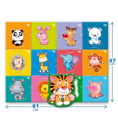 Far Far Land Maxi Puzzle zvieratká zo zoo. Balenie obsahuje 24 dielikov (12 puzzle dielikov + 12 dielikov so zvieratkami). Zložené 61x47 cm.