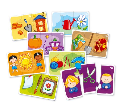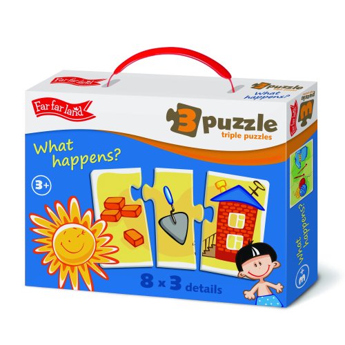 Far Far Land Puzzle činnosti trojice. Balenie obsahuje 8 puzzle obrázkov, ktoré sa skladajú z 3 dielikov (vyobrazujú trojice k sebe patriacich predmetov).