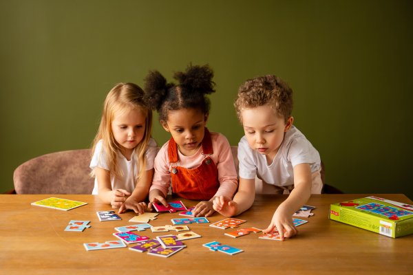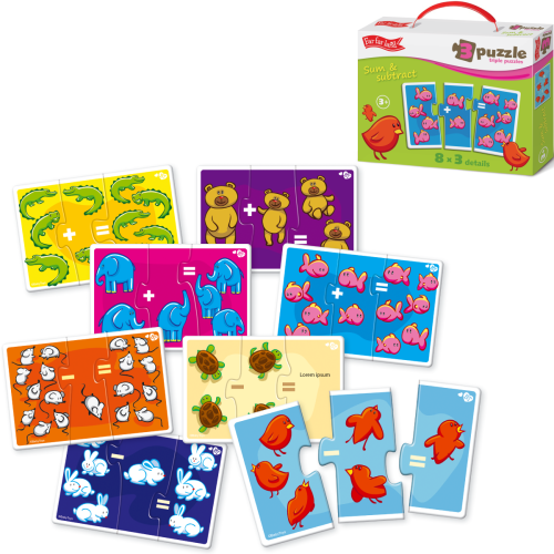 Far Far Land Puzzle počty. Balenie obsahuje 8 puzzle obrázkov s jednoduchými výpočtami - sčítanie a odčítanie do 10. Obrázky sa skladajú z trojíc dielikov.