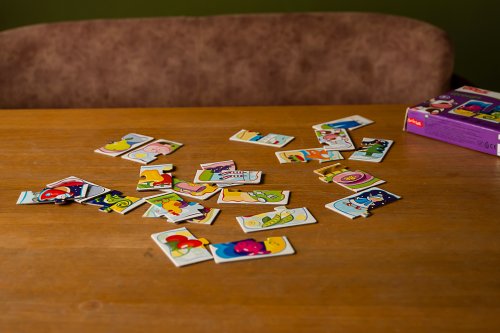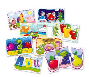 Far Far Land Puzzle trojica skupinky. Balenie obsahuje 8 puzzle obrázkov, ktoré sa skladajú z 3 dielikov (vyobrazujú trojice k sebe patriacich predmetov alebo postavičiek).