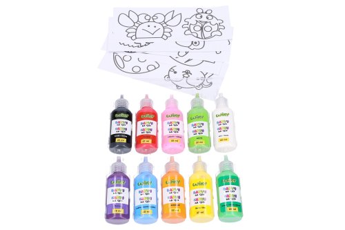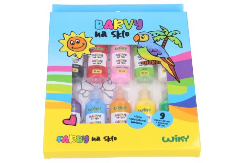Farby na sklo 9 +1 22 ml Obsahuje: 9 farieb (červená, ružová, zelená, biela, fialová, svetlo modrá, oranžová, žltá, tmavo zelená) 22 ml + kontúra čierna 22 ml + 2 fólie + obrázkové šablóny.