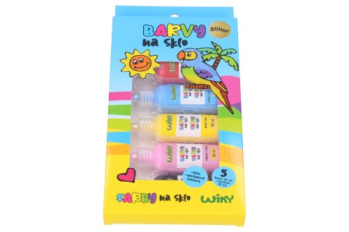 Farby na sklo glitter 5+1 22 ml Obsahuje: 4 farby (ružová, žltá, svetlo modrá, červená, zelená) 22 ml + kontúra čierna 22 ml + 2 fólie + obrázkové šablóny.