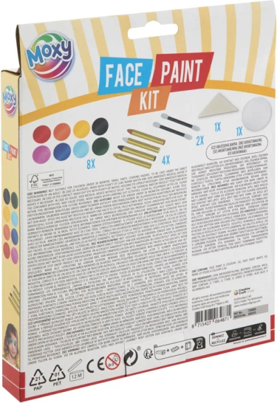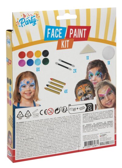 Sada farieb na tvár obsahuje 8 farieb na tvár, 4 farebné ceruzky, hubku a 2 kozmetické štetce. Rozmer balenia cca 22 x 17 x 2,5 cm. Vek 3+