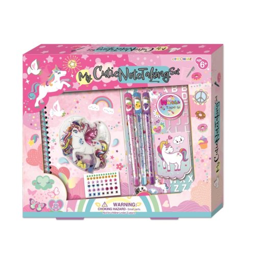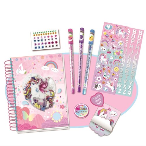 Zapíš si svoje zážitky a nakresli obrázky do bloku s jednorožcom. V balení tejto denníkovej sady nájdete Denník s motívom jednorožca, 3 gélové, trblietkové perá s vôňou, lepiace poznámkové bločky, nálepky s obrázkami a písmenkami, lepiacu obrázkovú pásku. Vhodné pre deti od 6 rokov.