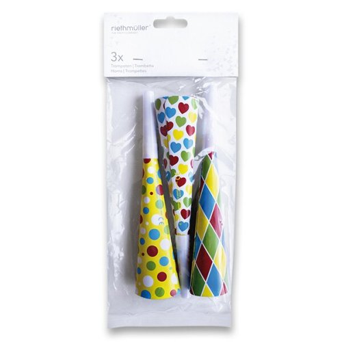 Farebné trúbky s rôznymi motívmi. Materiál kombinácia papiera a plastu. Dĺžka 22 cm.