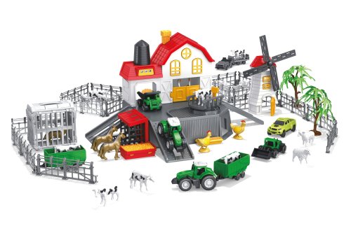 Farma so zvieratkami. Súčasťou všetko z obrázkov na obale - farma, mlyn, traktor s vlečkou, sklápač, nakladač, prepravné vozidlo, ohrada, stromy, figúrky zvieratiek (kone, sliepky, ovce, kozy, pes). Obrázkový návod na zloženie na zadnej strane obalu.