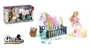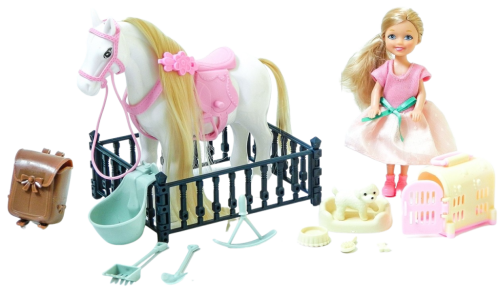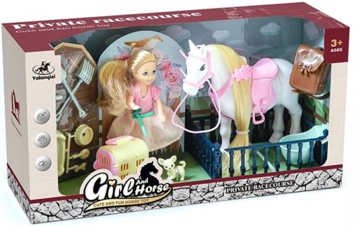 Súčasťou sady je koník, bábika, ohrada, psík, pelech a ďalšie doplnky. Výrobok je vhodný pre deti od 3 rokov.