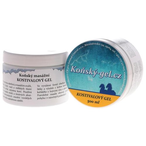 Gél na vonkajšie ošetrenie a masážam svalov, kĺbov, šliach, väzov a mäkkých tkanív veľkých zvierat, najmä koní. Používa sa na masáže opuchov a čerstvých akútnych nekrvácajúcich zranení vzniknutých úrazom alebo nadmernou záťažou. Vo vyváženej forme obsahuje chladivé látky a výťažok z koreňa kostihoja lekárskeho s hojivými slizmi a alantoínom. Pravidelné masáže obnovujú pružnosť pohybu aj v náročných podmienkach. Zloženie: Aqua, Alcohol Denat., Glycerín, Carbomer, Symphytum Officinale Root Extract, Phenoxyetanol, Ethylhexylglycerín, Camphor, Mentol, Allantoín, Caramel, Sodium Hydroxide. Návod na použitie: Po záťaži, alebo pri výskyte ťažkostí 1-2x denne vmasírovať do postihnutého miesta. Gél je možné zmývať vodou. Je použiteľný aj pre psy. Po aplikácii nebandážovať! Upozornenie: Skladujte pri teplote 15 - 25 °C. Uchovávajte mimo dosahu detí! Len pre zvieratá! Mikrobiologicky testované a bezpečné.