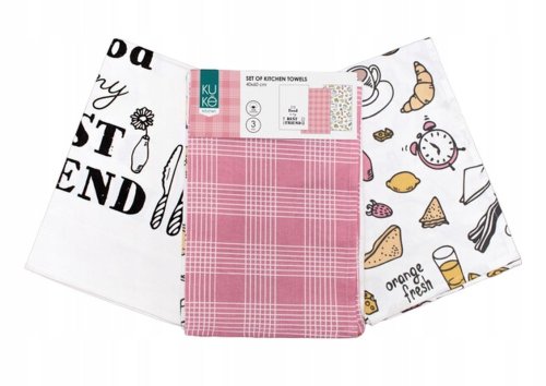 FARO Kuchynské utierky Kuke s potlačou sada 3 ks Raňajky 40/60 Štýlová sada troch bavlnených utierok Kuke s potlačou je praktickým pomocníkom aj modernou dekoráciou vašej kuchyne. Utierky o rozmere 40×60 cm sú vyrobené zo 100% bavlny, majú dobrú savosť a príjemný materiál. Vďaka kvalitnému spracovaniu a elegantnému dizajnu sa hodí na každodenné použitie aj ako originálny darček. Materiál: 100% Bavlna Rozmer: 3x 40/60 cm