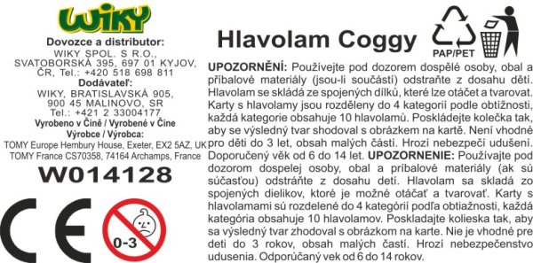 Hlavolam Coggy. Hlavolam sa skladá zo 16 spojených dielikov, ktoré je možné otáčať a tvarovať. Ideálne na cesty. Súčasťou balenia je 40 hlavolamov. Karty s hlavolamami sú rozdelené do 4 kategórií podľa obtiažnosti, každá kategória obsahuje 10 hlavolamov. Poskladajte kolieska tak, aby sa výsledný tvar zhodoval s obrázkom na karte. Prázdne miesta na karte môžu byť ľubovoľnej farby. Kolieska sú obojstranné (farebné a čiernobiele), každá strana slúži na riešenie iného druhu hlavolamu.