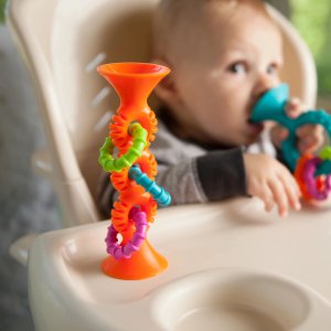 Pestrofarebné silikónové hryzátko, ktoré hrkajú a určite zaujme malé deti.