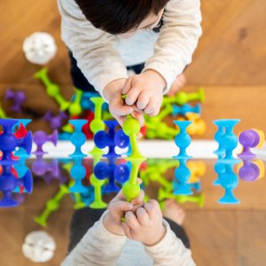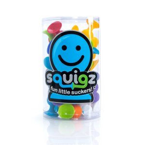 Fat Brain zábavné prísavky Squigz starter pack. Balenie obsahuje 22 ks prísaviek, rôznych farieb, druhov a veľkostí. Veľkosť jedného kusu je približne 6 cm v priemere.