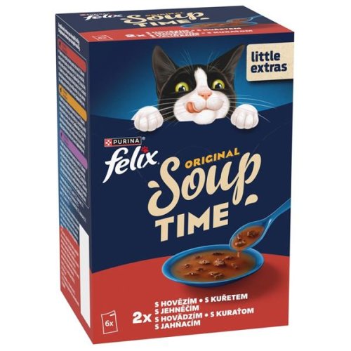 Felix Soup Original je chutná polievka vo forme lahodného vývaru so šťavnatými kúskami. Kapsičku stačí naliať do misky a mačka dostane ideálnu desiatu na dodanie energie aj toľko potrebných tekutín. Bez obsahu farbív a umelých konzervantov. Balenie obsahuje 6 kapsičiek v 3 príchutiach – s hovädzím, kuraťom a jahňacím. Zloženie: S hovädzím: mäso a výrobky živočíšneho pôvodu (z toho hovädzie 4 %), bielkovinové extrakty rastlinného pôvodu, ryby a vedľajšie výrobky z rýb, cukry, minerálne látky, vedľajšie výrobky rastlinného pôvodu, kvasnice. S kuraťom: mäso a výrobky živočíšneho pôvodu (z toho kura 4 %), bielkovinové extrakty rastlinného pôvodu, ryby a vedľajšie výrobky z rýb, cukry, minerálne látky, vedľajšie výrobky rastlinného pôvodu, kvasnice. S jahňacím: mäso a výrobky živočíšneho pôvodu (z toho jahňacie 4 %), bielkovinové extrakty rastlinného pôvodu, ryby a vedľajšie výrobky z rýb, cukry, minerálne látky, vedľajšie výrobky rastlinného pôvodu, kvasnice. Analytické zložky: proteín 7,5 %, obsah tuku 1,5 %, obsah anorganických látok 1,8 %, hrubá vláknina 0,2 %, vlhkosť 87,5 %. Nutričné doplnkové látky: zchutňujúce látky Kŕmny návod: Dospelú mačku (4 kg) kŕmte 1 kapsičkou denne ako doplnok ku kompletným krmivám značky Purina. Podávajte pri izbovej teplote. Mačka by mala mať vždy k dispozícii čerstvú pitnú vodu. Časť odporúčaného denného príjmu tekutín vašej mačky bude dodaná prostredníctvom príjmu tohto krmiva vďaka jeho vysokému obsahu vlhkosti.