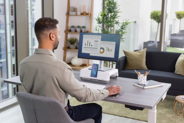 Praktický podstavec pre monitor zdvíha obrazovku na úroveň očí, čím zmierňuje svalové napätie ramien a šije. Výšku je možné ľahko nastaviť v troch úrovniach. Súčasťou je aj priehradka s otvorom pre nabíjací kábel, napríklad na umiestnenie mobilného telefónu.