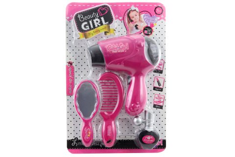 Súprava pre malé kaderníčky. Balenie obsahuje fén, zrkadlo, hrebienok a fľaštičku na voňavku. balené na blistri. Napájanie fénu na 1xAA batériu (nie je súčasťou balenia). Rozmery balenia cca 19x27x3,5 cm. Vek 3+