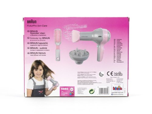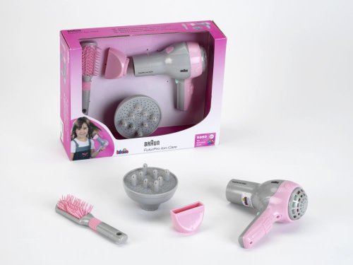 Funkčný detský fén značky Braun s doplnkami. Fúka. Batérie 1 x AA, nie sú súčasťou balenia.