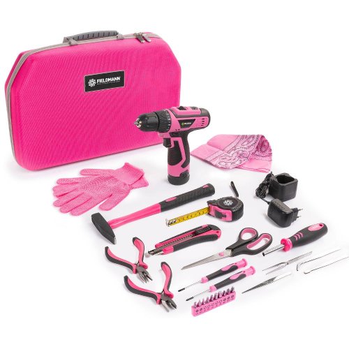 Súprava náradia s vŕtačkou FDG 5026-28R od značky Fieldmann nadchne predovšetkým ženy, a to vďaka svojej pastelovo ružovej farbe. Kutilky, ktoré si trúfnu na údržbárske činnosti, ocenia aj skvelú skladnosť náradia. Táto univerzálna šikovná sada sa hodí na bežné opravy a údržbu v domácnosti. Využijete ju doma, v dielni aj na záhrade. Zahŕňa praktickú vŕtačku, kombinované kliešte, kladivo, skrutkovače, nožnice, 3metrové meracie pásmo, ochranné rukavice, šatku na hlavu a mnoho ďalšieho. Potrebná práca sa okamžite stane zábavou, či už budete pracovať sami alebo s nejakým pomocníkom. Sada bude vždy pekne po ruke, pripravená na akúkoľvek výzvu.