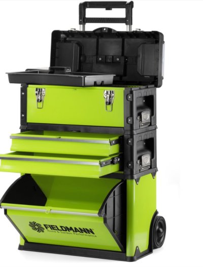 Novinka v sortimente značky Fieldmann – trojdielny box na náradie FDN 4150, je vyrobený z kovu, má teda pevnú konštrukciu, ktorá zaistí odolnosť aj bezpečie pre uložené veci. S jeho pomocou ľahko, rýchlo a bez väčšej námahy dopravíte množstvo nástrojov, príslušenstva a drobného materiálu aj na väčšie vzdialenosti napr. na chalupu, na stavbu a pod. Jednotlivé časti boxu sú členené tak, aby mal každý nástroj či materiál svoje miesto a užívateľ nemusel strácať čas zdĺhavým hľadaním. V menších priehradkách vo veku horného boxu uložíte drobný, napr. spojovací materiál, o ktorom budete mať perfektný prehľad vďaka krytu z priehľadného pevného plastu. Vyberateľná plastová priehradka s rukoväťou potom pojme ďalšie drobnosti a náradie av boxe zostane ešte dosť priestoru na väčšie nástroje. Druhý diel ponúka dve výsuvné zásuvky s dostatkom miesta napr. pre sadu najčastejšie používaných skrutkovačov alebo kľúčov. Spodný diel – veľký úložný box s výklopným vekom – potom poskytuje naozaj veľkorysý priestor pre pomocníkov väčších rozmerov, akými sú elektrický skrutkovač, vŕtačka, brúska a pod. Všetky tri boxy sú opatrené vyklápacími madlami, aby ich bolo možné prenášať aj jednotlivo. Každý z nich je po stranách vybavený tiež pevnými prackami, ktorými sa medzi sebou vzájomne prepoja v jeden pevný celok, aby bola zaistená stabilita i bezpečnosť celej sady pri prevážaní. Robustné teleskopické madlo poslúži pri prevoze, pri manipulácii s jednotlivými časťami ale nebude prekážať. Kolieska z tvrdeného plastu zaručujú dlhú životnosť celého boxu.