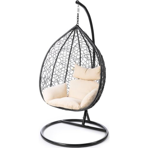 Pohodlné závesné kreslo Sedací kôš s oceľovým rámom je vypletený umelým ratanom Materiál: oceľová konštrukcia, ratan, polyester Vankúše súčasťou balenia v krémovej farbe Bezúdržbový, odolný voči poveternostným vplyvom
