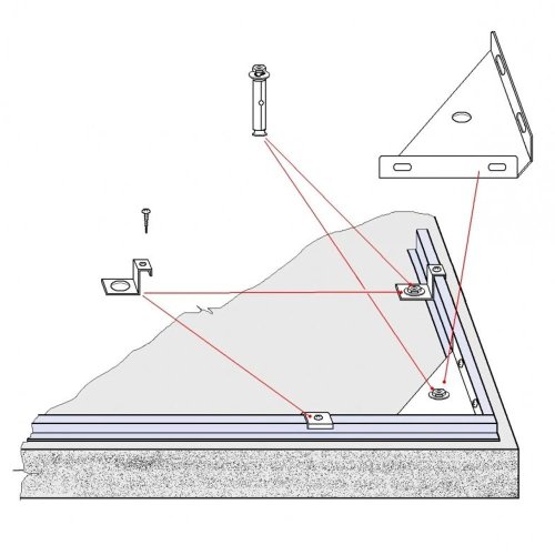 Obsah sady 4× rohový plech 12× úchytný pliešok 16× skrutka Kovová hmoždinka do betónu