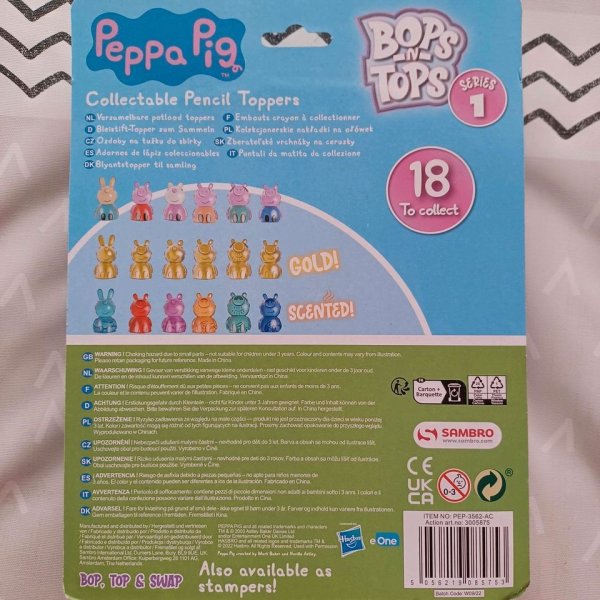 Tieto malé roztomilé figúrky z obľúbeného filmu Prasiatko Peppa čakajú, kedy si s nimi ozdobíš svoje ceruzky. Každú postavičku môžeš nasunúť na pastelku. Vyfarbovanie, písanie aj kreslenie nebolo nikdy zábavnejšie. Postavičku si môžeš zložiť a zahrať si s ňou rôzne príbehy. V balení nájdeš 5 postavičiek (jednu zlatú a jednu voňavú). Celkom ich môžeš pozbierať až 18 (6 normálnych, 6 zlatých a 6 voňavých).