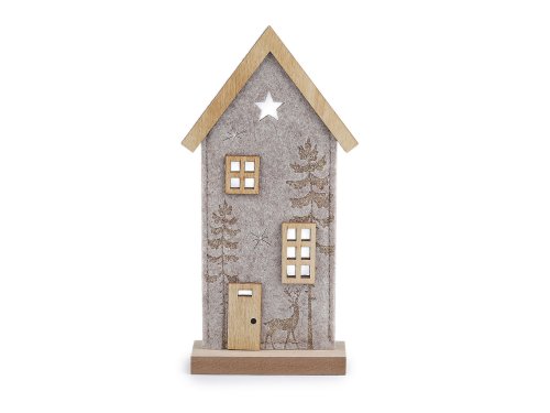 Dekoračný domček má základ z pevného filcu a strechu, podstavec a detaily z dreva. Prednú stranu zdobí motív lesa s jeleňom a výrezmi hviezd. Zútulnia každý interiér. Domček je ideálny na rôzne sezónne a sviatočné obdobia, zvlášť ako štýlová vianočná dekorácia. Môžete ho umiestniť na krbovú rímsu, okenný parapet, poličku alebo vynikne ako súčasť väčšej dekoratívnej kompozície na stole.