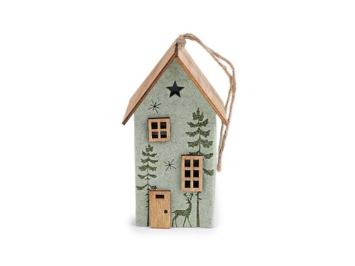 Svietiaci dekoračný domček má základ z pevného filcu a strechu a detaily z dreva. Prednú stranu zdobí motív lesa s jeleňom a výrezmi hviezd. Svieti príjemným teplým svetlom, ktoré zútulnia každý interiér. Vďaka pútku ho môžete zavesiť na vetvičky vo váze, na vence aj na vianočný stromček. Batéria (CR2032) je súčasťou balenia.