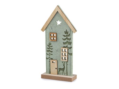 Dekoračný domček má základ z pevného filcu a strechu, podstavec a detaily z dreva. Prednú stranu zdobí motív lesa s jeleňom a výrezmi hviezd. Zútulnia každý interiér. Domček je ideálny na rôzne sezónne a sviatočné obdobia, zvlášť ako štýlová vianočná dekorácia. Môžete ho umiestniť na krbovú rímsu, okenný parapet, poličku alebo vynikne ako súčasť väčšej dekoratívnej kompozície na stole.