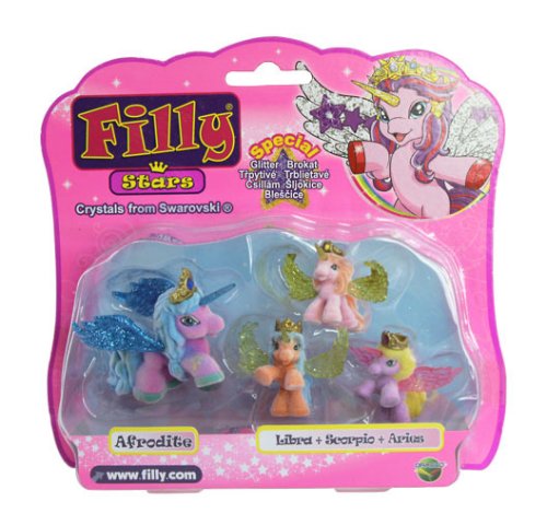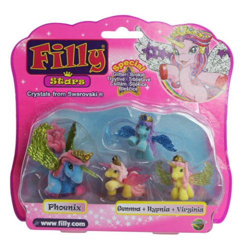 Z veľmi vzdialenej tajuplnej krajiny k vám pricválali noví Filly koníčkovia, koníčkovia Filly Stars. Majú kúzelné rohy a prekrásne trblietavé krídla. Každý koník má zlatú korunku, ktorú zdobí farebný krištáľ. Doplňte svoju zbierku o Filly koníčka s tromi malými koníčkami. Rozmery balenia 18 x 17 x 5 cm. Vhodné pre deti od 3 rokov.