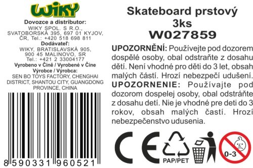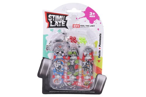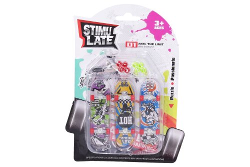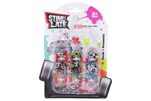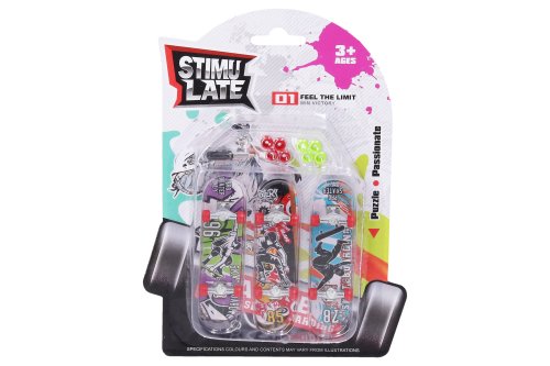 Fingerboard súprava 3 ks. Obsah balenia - 3 kompletné fingerboardy, 2x sada farebných koliesok, náhradné skrutky a skrutkovač. Rozmery skateboardu 9,5x2,5x2 cm.