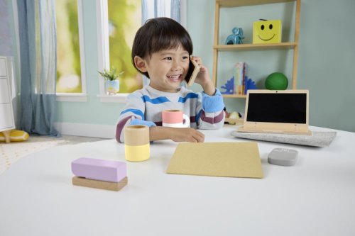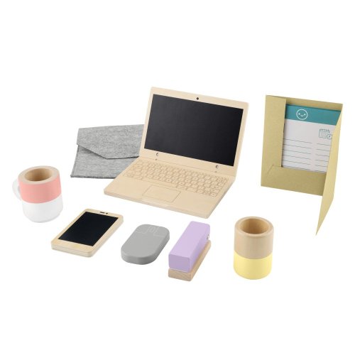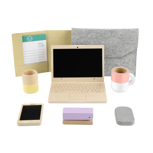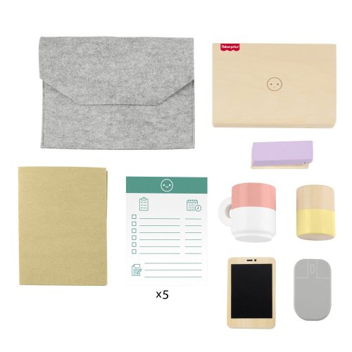 S dreveným herným setom pre prácu z domu od Fisher-Price® sa deti v predškolskom veku môžu zahrať na povolanie mamičky alebo otecka. Set obsahuje 9 dielov: prenosný počítač a telefón s kriedovými obrazovkami, počítačovú myš, hrnček na kávu, zošívačku, kelímok s perom, zložku na dokumenty a sadu dokumentov. Dieliky sú vyrobené z dreva zo zdrojov s certifikáciou Forest Stewardship Council (FSC C130462).