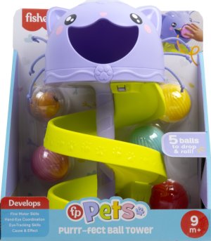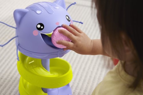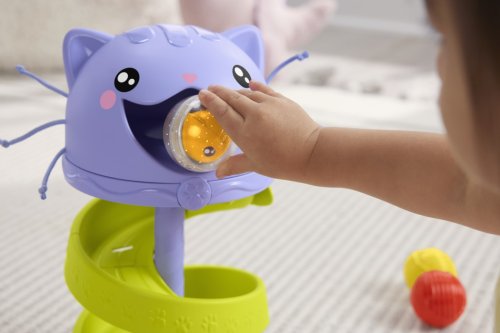 Bábätká a batoľatá si zamilujú kotúľajúcu sa loptičku v Mačičkovej guličkovej dráhe od Fisher-Price®. Táto parádna mačička má stupňovitú guličkovú vežu so 4 ľahko uchopiteľnými farebnými „priadzovými“ guličkami a 1 guľôčku s hrkajúcou rybičkou, ktorú môžu deti vložiť do tlamičky mačičky a poslať ju po dráhe dole, aby mohla zábava začať od začiatku! Táto hračka je skvelým spôsobom, ako si dieťa pri hre posilňuje jemnú motoriku a zažíva vzrušujúce príčiny a dôsledky. Farby a prevedenia sa môžu líšiť.