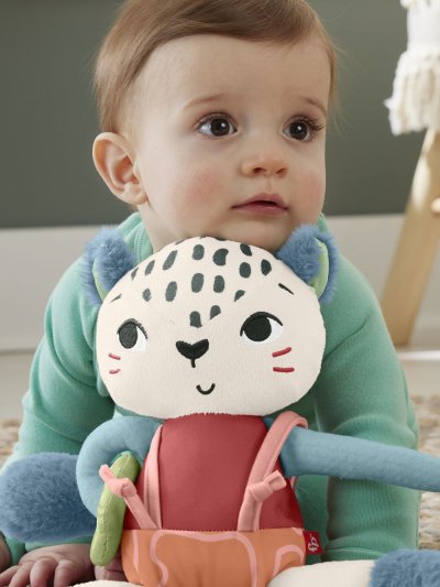 Detská zmyslová hračka Snežný leopard od Fisher-Price® je inšpirovaná zvieratami, na ktoré upozornil Svetový fond na ochranu prírody, používa látku vyrobenú z 95% z recyklovaných plastov a je dodávaná v obale s certifikátom FSC, ktorý podporuje zodpovedné lesné hospodárstvo. Táto plyšová hračka ponúka saténové látky, mäkké chlpaté vlnito topánočky a vysoko kontrastné farby, ktoré rozvíjajú zmysly vášho dieťatka. Zábavné aktivity pre rozvoj jemnej motoriky zahŕňajú naťahovacie nožičky, posuvný podbrušník a mäkký posuvný krúžok na ruke. Hračka nielen zábaví, ale aj poskytuje vášmu dieťatku pocit bezpečia doma aj na cestách, a je možné ju prať v práčke.