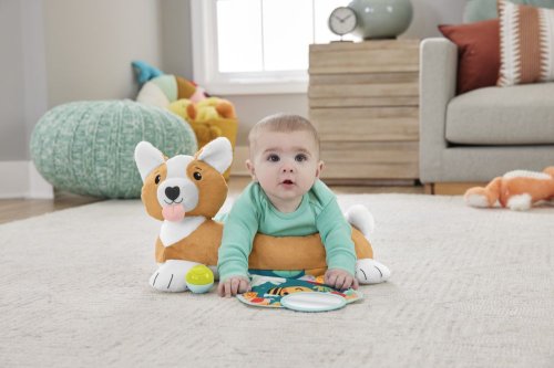 Plyšová hračka Vankúšik pod bruško psík od Fisher-Price® podporuje vaše dieťatko pri hre na brušku a rozvíja jeho fantáziu. Tri hračky vrátane hryzátka, hrkajúcej loptičky a zrkadlá pre sebapoznávanie zaistia zábavné chvíľky.