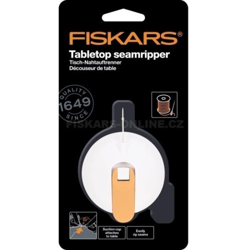 Stolný párač švov Fiskars s prísavkou pre ľahké páranie švov <br> Manipulujte s látkou oboma rukami <br> Kryt párača je možné uložiť pod upínaciu páku