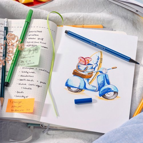 Vysoko kvalitná fixka s vláknovým hrotom a výraznou intenzitou farieb pre silné čiary a veľké plochy. Štíhle plastové telo a priedušný uzáver vo farbe náplne.