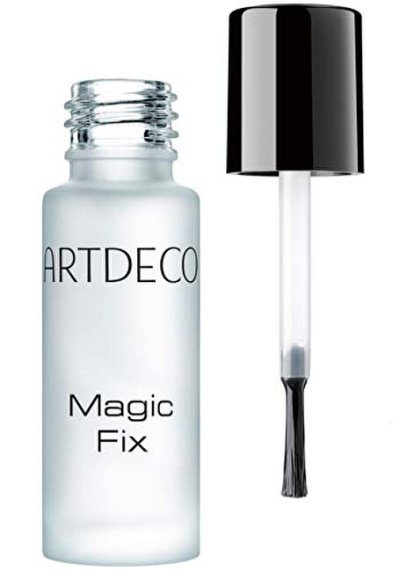 Po aplikácii kontúrovacej ceruzky a rúžu si po perách poklepte kozmetickým obrúskom. Pomocou štetca naneste Magic Fix jedným ťahom na hornú peru a jedným ťahom na dolnú peru, vrátane kontúr. S ľahko otvorenou pusou nechajte zaschnúť, potom si mierne navlhčite pery jazykom. Pokiaľ je rúž veľmi mastný, aplikáciu zopakujte.