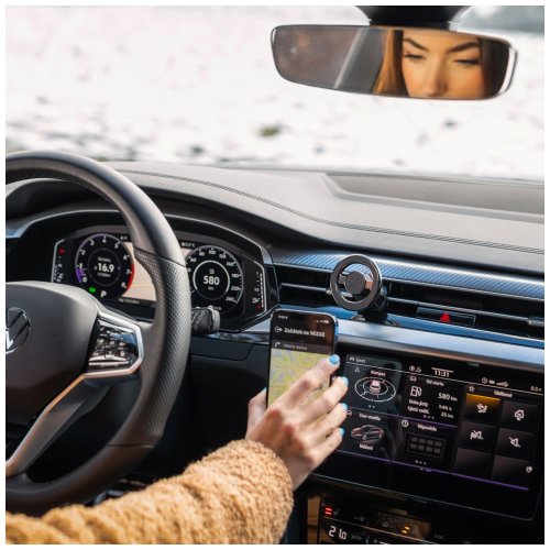 Magnetický držiak s funkciou MagSafe Pre pripevnenie do mriežky ventilácie Navrhnutý priamo pre Apple iPhone série 12 a vyššie Špeciálna nalepovacia podložka pre použitie s ostatnými telefónmi bez MagSafe 18 integrovaných magnetov po obvode Uťahovacie kliešte s istiacim hákom pre pevné uchytenie telefón aj pri najväčších otrasoch Otočný kĺb pre nastavenie do ideálneho pozorovacieho uhla