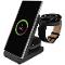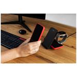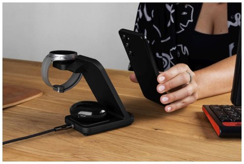 Priložte svoj mobilný telefón k hlavnej nabíjacej ploche s výkonom až 15 W, ktorú nájdete na prednej strane držiaka. Dokonca ani nezáleží na tom, či ho umiestnite vertikálne alebo horizontálne . O stave nabíjania vás informuje praktická LED dióda . Pokiaľ sa chystáte nabíjať TWS slúchadlá , použijete sekundárnu plochu s výkonom 5 W na podstavci stojanu. Je kompatibilný nielen so slúchadlami, ale aj s telefónom či iným zariadením s bezdrôtovým nabíjaním. Posledná nabíjacia plocha je určená pre inteligentné hodinky Samsung Galaxy Watch . Tento adaptér môžete odopnúť a pripojiť do iných nabíjačiek pomocou USB-C konektora .