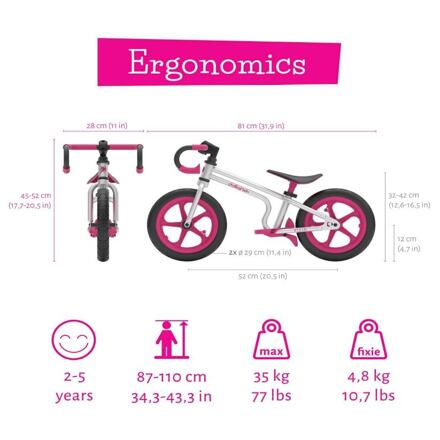 Chillafish Fixie Pink je moderné a vysoko kvalitné odrážadlo určené pre deti vo veku 2 - 5 rokov as výškou postavy 87 - 110 cm. Jeho konštrukcia je tvorená z odolnej ocele a maximálne zaťaženie je do 35 kg. Detské odrážadlo Fixie Pink má integrovanú brzdu, nastaviteľné riadidlá so športovým dizajnom a nastaviteľné sedadlo v rozmedzí 32 - 40 cm. Tréning na detskom balančnom bicykli Chillafish Fixie Pink bude skvelou prípravou na jazdu na klasickom bicykli s pedálmi. Upozornenie: - Odrážadlo by deti mali vždy používať iba pod dohľadom dospelej a zodpovednej osoby! - Pred použitím si prečítajte manuál, ktorý je súčasťou balenia. Parametre: - vysoko kvalitný oceľový rám - nastaviteľné riadidlá so športovým dizajnom - nastaviteľné sedadlo od 32 cm do 40 cm (12.6 in - 15.8 in) - integrovaná nožná brzda - gumy Airless RubberSkin: bez nafukovania, skvelá priľnavosť - nízka hmotnosť (necelých ) a ergonomický tvar - pre deti vo veku 2 - 5 rokov, s výškou postavy 87 - 110 cm - max. zaťaženie 35 kg - rozmery balenia: 72 x 31 x 15 cm - hmotnosť balenia: 5,45 kg - jednoduchá montáž, imbusové kľúče súčasťou balenia