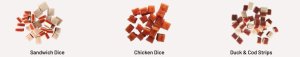 Sendvičové kocky : kuracie 42,2%, ryba 18%, treska 14,5%, glycerín 10,1%, škrob 6,7%, arašidový proteín 2,3%, hrachový proteín 2,3%, sorbitol 3,7%, soľ 0, Analytické zložky: vlhkosť 23%, hrubý proteín 20%, hrubý popol 8%, hrubá vláknina 3%, hrubé tuky 1%, chlorid sodný 0,2%.