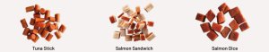 Lososové kocky : ryba 43,7%, kuracie 20%, škrob 18%, sójový proteín 2%, arašidový proteín 1%, hrachový proteín 1%, glycerín 12%, sorbitol 2%, soľ 0,3%. Analytické zložky: hrubý proteín 23%, vlhkosť 23%, hrubý popol 8%, hrubá vláknina 3%, hrubé tuky 0,5%, chlorid sodný 0,3%.