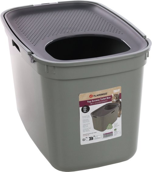 Predstavujeme olivovo zelenú mačaciu toaletu s vrchným vstupom. Je vyrobená z 98% z recyklovaného plastu. Disponuje bezšvovou základňou a bokmi na zabránenie úniku. Vysoký okraj zabraňuje vyhadzovaniu podstielky a veľký vstupný otvor zaisťuje ľahké vyberanie. Odnímateľné veko má integrovanú drenážnu podložku a zaoblené rohy robia čistenie detskou hrou. Vyrobené v Európe.