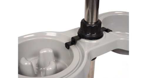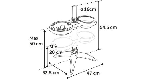 S praktickým stojanom s dvoma miskami SUVI budete mať jedlo a vodu pre svojho psa vždy na jednom mieste. Vďaka gumovým nôžkam je stojan protišmykový. Misky sú nastaviteľné až do výšky 54 cm a uchytia sa pomocou rýchlej svorky. Misky je možné umývať v umývačke. Objem misiek: 600 ml a 800 ml