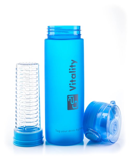 Modrá fľaša G21 na smoothie/juice v mrazivom dizajne je vyrobená z odolného a nezávadného tritánu. Má objem 600 ml a je to praktický parťák nielen na doma, ale aj do prírody alebo na šport. Navyše obsahuje plastové vkladacie sitko na lúhovanie byliniek, kúskov ovocia alebo čajov.