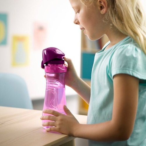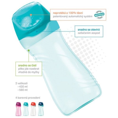 • neobsahuje bisfenol A ani ftaláty, * ľahké otváranie vrchného krytu zatlačením zospodu, * hrdlo nepreteká a 100% tesní, * automatický systém bráni pri ukončení pitia v úniku nápoja, * pre uvoľnenie prietoku nápoja náustkom je potrebné zase hrdlo stlačiť dole, * dôkladne umyť, široký otvor, * možno umývať v umývačke