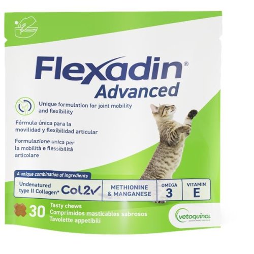 Charakteristika: Veterinárny prípravok / doplnok krmiva pre mačky, v podobe ochutených medikovaných granúl. Podporuje metabolizmus kĺbov. Indikácie: Osteoartritída (artróza) je progresívne degeneratívne ochorenie kĺbov najmä u starších mačiek, je sprevádzaná pohybovými ťažkosťami, bolestivosťou a deformáciami kĺbov. Účinné látky: Kolagén UC II ® (nedenaturovaný kolagén typu II), má preukázateľný pozitívny účinok u mačiek s osteoartritídou, Ďalšie látky podporujúce metabolizmus kĺbov (mastné kyseliny omega 3 a omega 6, vitamín E). Zloženie: Pivovarské kvasnice, ovsená múka, ovsené vločky, ražná krupica, glycerín, prášok z kuracej pečene, ľanový olej (zdroj omega-3 polynenasýtených mastných kyselín), prášok z kuracích chrupaviek obsahuje UC-II ® (obsah ), kolagénový prášok celkom 1,22 % (vrátane nedenaturovaného kolagénu typu II: 0,15 %) 4,8 %, rybí olej (zdroj kyseliny dokosahexaenovej, DHA), pektín, sacharóza, maltodextrín, dihydrát síranu vápenatého. V tablete: Celkom omega-3 mastných kyselín 25,42 mg, celkový obsah kyseliny dokosahexaenovej (DHA) 2,37 mg, metionín 12 mg, celkový obsah mangánu 1,9 mg, celkový obsah vitamínu E 7,7 IU. Dávkovanie: 1 tableta denne bez ohľadu na hmotnosť mačky, priamo perorálne alebo s krmivom.