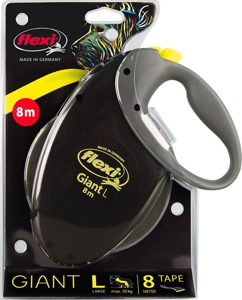 Niečo mimoriadne pre veľké psy. Robustné vodítko Giant je ľahko ovládateľné a mäkká rukoväť sa krásne drží. Neónový farebný pásik zaisťuje lepšiu viditeľnosť aj z veľkej diaľky. Vyskúšaný a osvedčený mechanizmus v masívnom puzdre zastaví jednoduchým stlačením tlačidla aj najsilnejší pohyb vpred. Vodítko prechádza pred expedíciou mnohými kontrolami kvality. Rodinná firma flexi vyrába výhradne na území Nemecka. V závode v Bargteheide pri Hamburgu vzniká všetko, počnúc návrhom až po výrobu vysoko kvalitných vodítok – Made in Germany. Firma flexi je vynálezcom samonavíjacieho vodítka a jednotkou na svetovom trhu, exportuje do viac ako 90 krajín sveta. Originálne samonavíjacie vodítka flexi sa vyznačujú patentovaným, po technickej stránke najmodernejším pružinovým systémom a komfortným ovládaním. Sú vyrábané z vysoko kvalitných materiálov, exkluzívne manuálne spracované a zostavené. Vodítka prechádzajú pred expedíciou mnohými kontrolami kvality. Veľkosť: L – vhodné pre psy s hmotnosťou do 50 kg. Typ vodítka: Navíjací – opasok. Dĺžka opasku/lanka: 8 m Farba: čierna