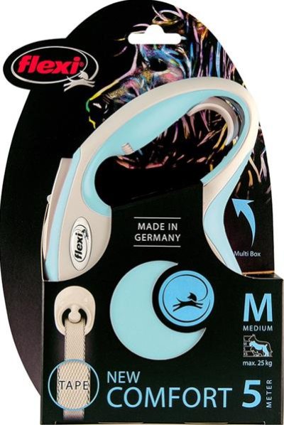 Dokonale navrhnuté dvojfarebné vodítko Vás upúta na prvý pohľad. New Comfort ponúka všetky funkcie, ktoré potrebujete a preto si ho čoskoro zamilujete! Vylepšený brzdový systém s krátkym zdvihom umožňuje viac kontroly, ergonomické držadlo je nastaviteľné podľa veľkosti ruky (od veľkosti M). Možno pridať aj Multi Box na ukladanie maškrty či sáčkov (od veľkosti S). Rodinná firma flexi vyrába výhradne na území Nemecka. V závode v Bargteheide pri Hamburgu vzniká všetko, počnúc návrhom až po výrobu vysoko kvalitných vodítok – Made in Germany. Firma flexi je vynálezcom samonavíjacieho vodítka a jednotkou na svetovom trhu, exportuje do viac ako 90 krajín sveta. Originálne samonavíjacie vodítka flexi sa vyznačujú patentovaným, po technickej stránke najmodernejším pružinovým systémom a komfortným ovládaním. Sú vyrábané z vysoko kvalitných materiálov, exkluzívne manuálne spracované a zostavené. Vodítka prechádzajú pred expedíciou mnohými kontrolami kvality. Veľkosť: M – vhodné pre psy s hmotnosťou do 25 kg. Typ vodítka: Navíjací – opasok. Dĺžka opasku/lanka: 5 m Farba: svetlo modrá